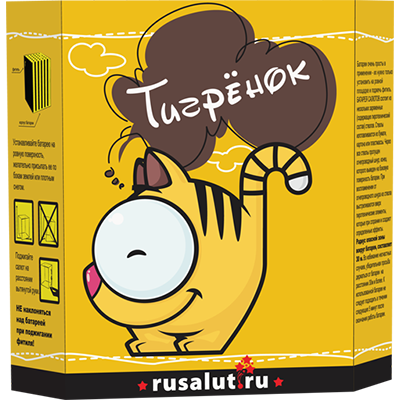 Батарея салютов «Тигренок» разработана специально для маленьких, что нашло отражение и в дизайне коробки. Имейте в виду, что запускать этот фейерверк можно только взрослым, с соблюдением техники безопасности и строго по инструкции! Кстати! Тигры, как и подавляющее большинство диких животных, безумно боятся пиротехники. Более того, даже домашние кошки и псы впадают в панику, едва заслышав грохот петард.