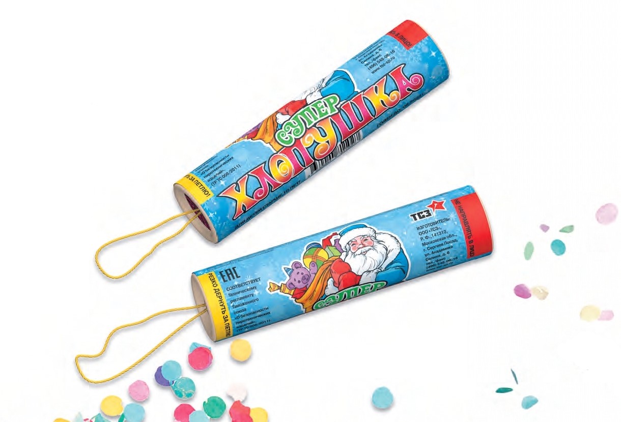 Супер-хлопушка «Новогодняя» ТР102 бренда ТСЗ — отличная альтернатива петардам, которая не содержит пороха и потому абсолютно безопасна. При «взрыве» изделие исторгает из себя цветные бумажки, призванные изображать пиротехнические искры. Его можно использовать не только на улице, но и в доме (если вы, конечно, готовы убраться после веселого праздника, ведь конфетти рассыпаются прямо на пол). В целом, главное впечатление пневмохлопушка производит громким звуком — отсюда и название.
